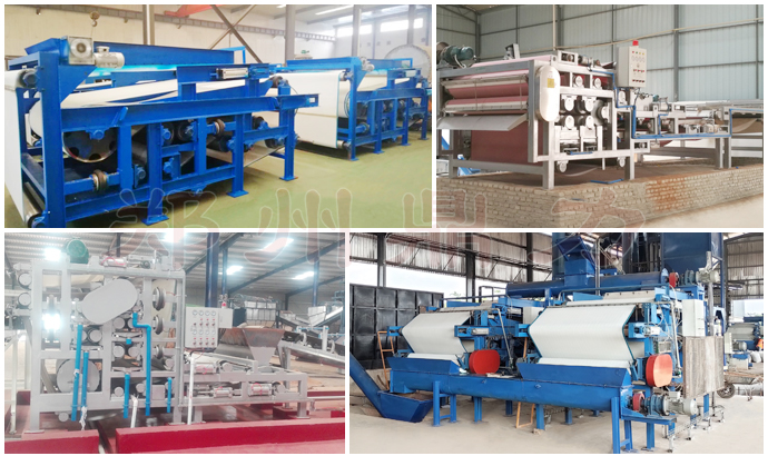 物料經過輸送機,輸送到脫水機的料斗中,經過螺旋布料器均勻地鋪在濾帶上,濾帶隨著設備的運行,限料板把料層高度刮平,使料的厚度完全均勻一致;然后上下兩條完全漲緊的環(huán)狀濾帶夾住料層,在驅動輥帶動下,脫水區(qū)內的對輥連續(xù)多次機械擠壓,將大量的水份壓出。根據物料的特點自動調節(jié)擠壓力,滿足客戶對物料水分要求。