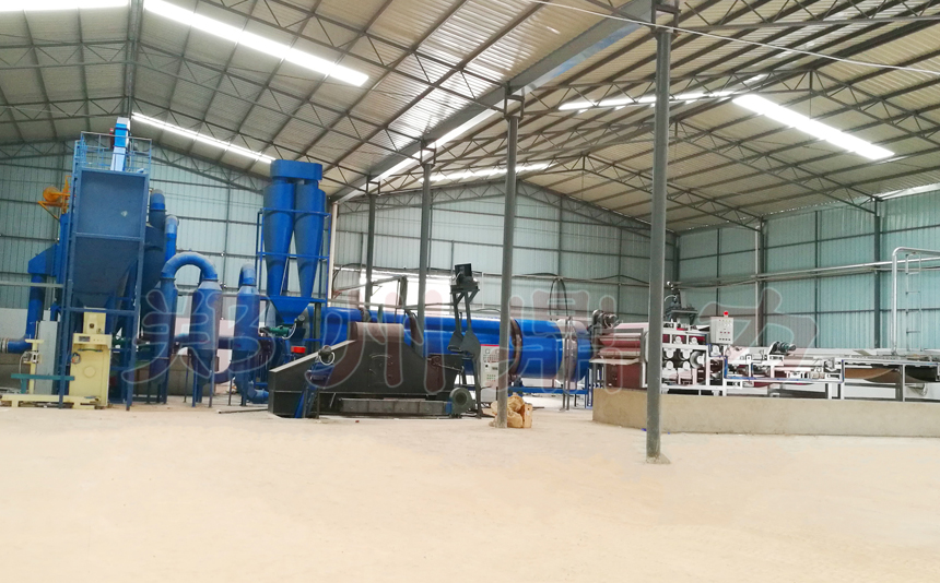 經(jīng)過預(yù)先脫水的紅薯渣有喂料系統(tǒng)進(jìn)入滾筒烘干機(jī),在持續(xù)打散和震打清理的烘干系統(tǒng)中以兩退一進(jìn)的方式行進(jìn),揚(yáng)料均勻,受熱均勻,該種烘干結(jié)構(gòu)有效解決了薯渣等相似物料烘干存在的糊料和黏壁問題,持續(xù)受熱強(qiáng)力蒸發(fā)達(dá)到干料含水35%以下進(jìn)入的排出滾筒烘干機(jī),粉碎后進(jìn)入氣流烘干環(huán)節(jié),10-15秒內(nèi)完成快速干燥,達(dá)到預(yù)定含水標(biāo)準(zhǔn),進(jìn)入灌裝系統(tǒng),進(jìn)行打包。而氣流進(jìn)入除塵凈化系統(tǒng),達(dá)到環(huán)評(píng)要求后排出,至此完成薯渣好烘干全過程。