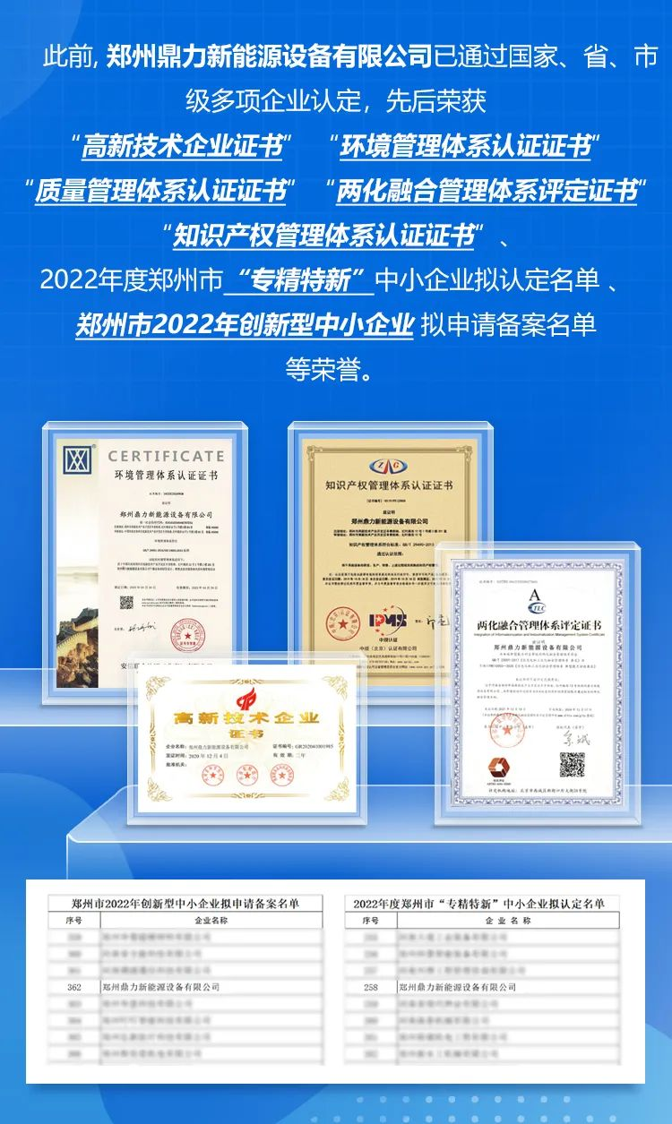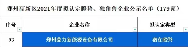 時至一年,在2023年2月10日,鄭州高新技術產業開發區管理委員會發布了《鄭州高新區關于公示2022年度擬認定瞪羚、獨角獸企業名單的通知》,鄭州鼎力新能源設備有限公司憑借在新能源設備行業領域突出的科技創新能力與技術優勢,成功入選“2022年度鄭州高新區瞪羚企業名單”。